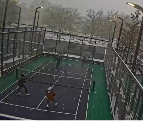Heaters beneath the court help evaporate moisture quickly, allowing play to continue even during snow or rain. “It’s a blast. You feel like you’re playing in a snow globe,” she says.
