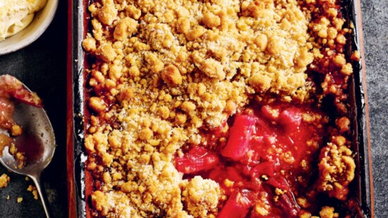 In a bowl, combine flour, brown sugar, oats and remaining sugar. Cut in butter until crumbly; sprinkle over rhubarb. Bake at 400° for 30 minutes.