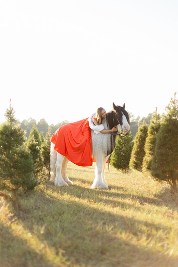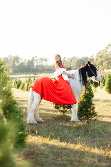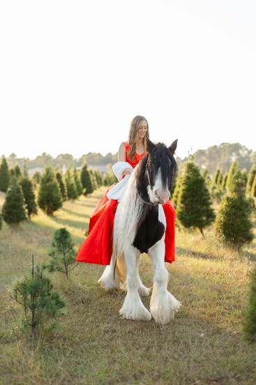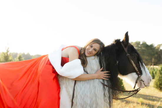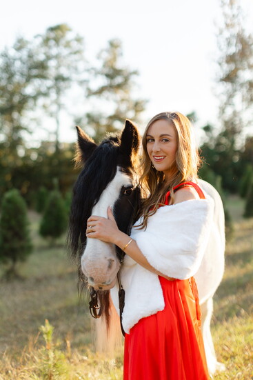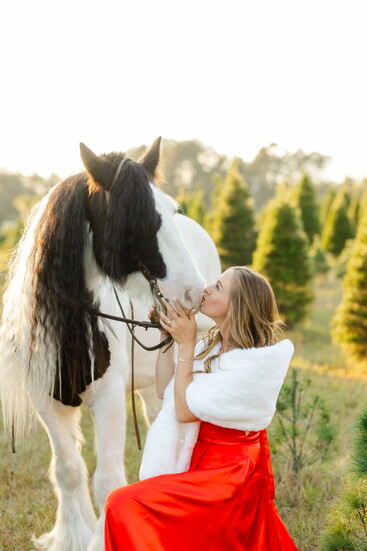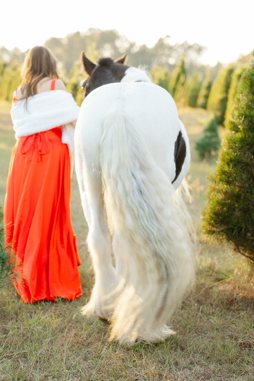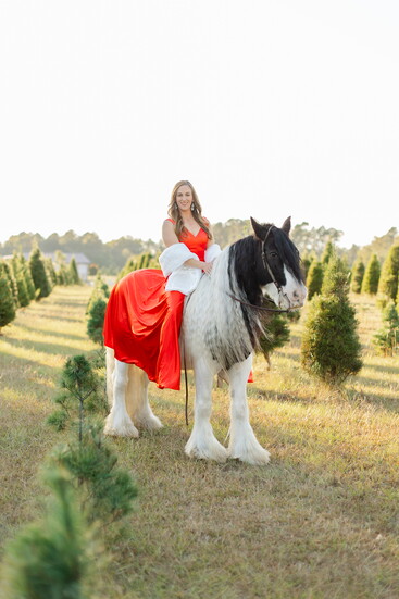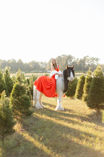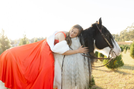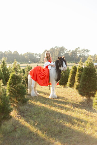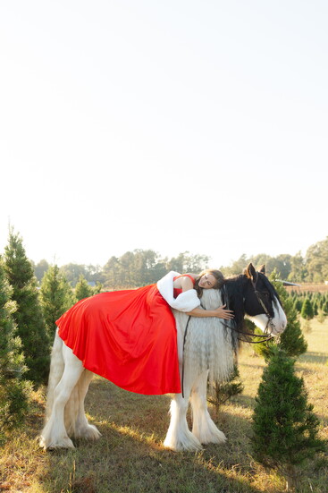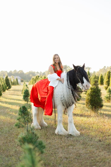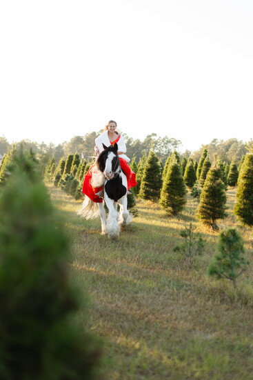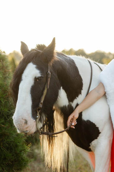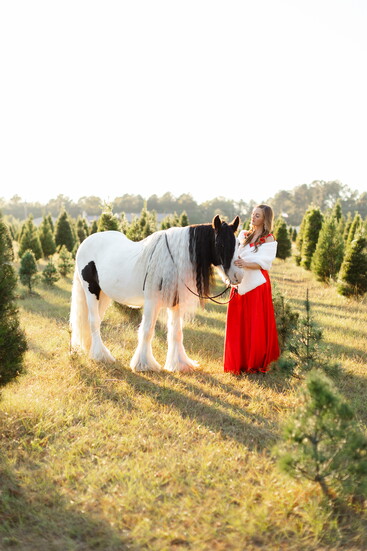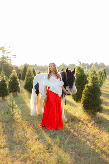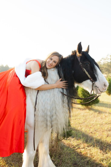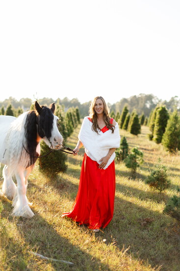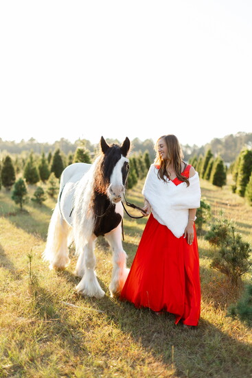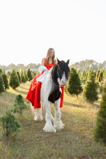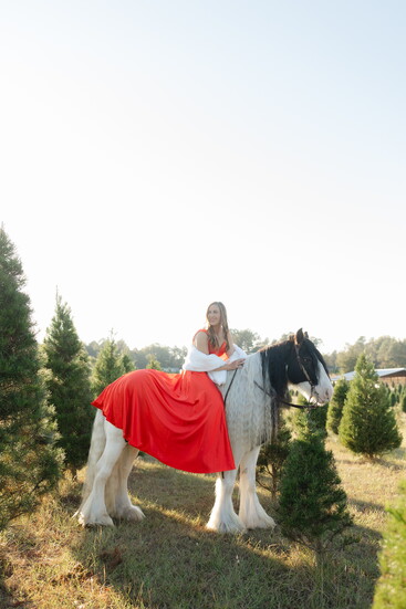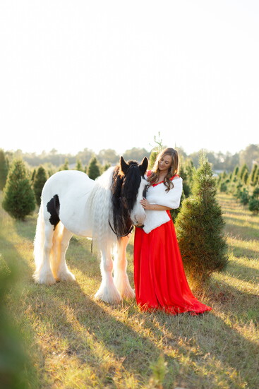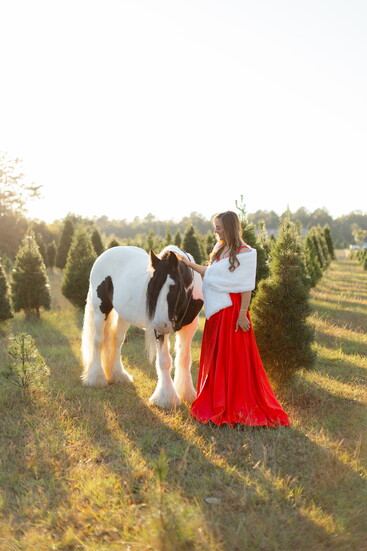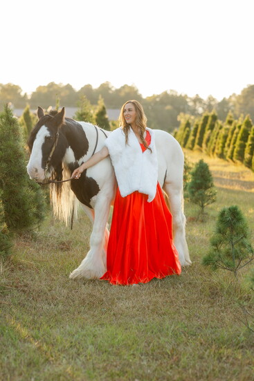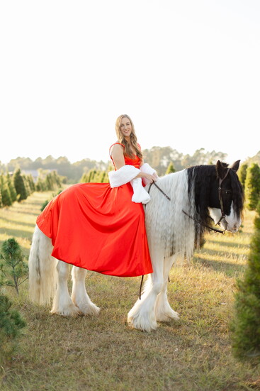 For the magazine’s Christmas feature, Still Creek Tree Farm proved to be the perfect setting for a festive photoshoot. Morgan Batton, owner of The Hitch and Tow, embodied the elegance of the season, modeling in exquisite Christmas finery. She was joined by Panda, a breathtaking Gypsy Vanner horseprovided by local trainer Nicola Bolt, adding a touch of equestrian grace to the scene.