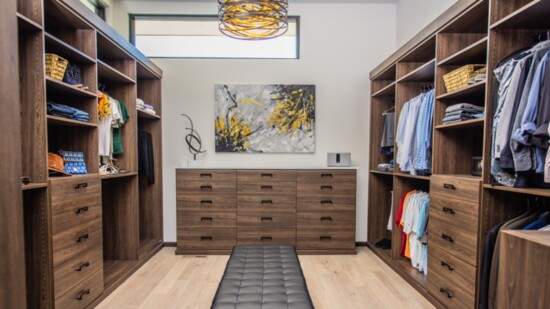 Although the classic white finish is a client favorite in many closets Lewis designs, The Tailored Closet also carries a wide variety of wood grain finishes, like the dark tones featured here in this new home build-in collaboration with interior designer Joey Kempler.