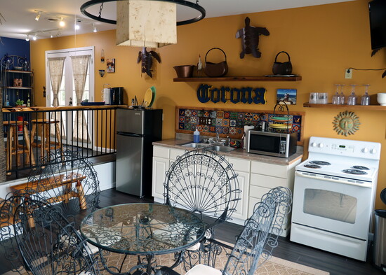 The Farmhouse—the largest of the three rentals—is a sprawling four-bedroom home with brick floors, rustic industrial touches, and rooms filled with multicultural flair, inviting visitors to step into one of the many places Beth’s parents have traveled, sharing their memories with others. It’s ideal for large families and multigenerational stays.