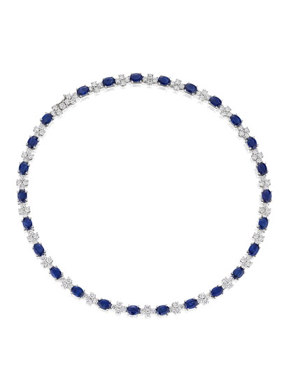 The Sabel Collection at Fink’s Jewelers showcases an extraordinary array of diamond and precious gemstone jewelry, including this breathtaking sapphire and diamond cluster necklace. Crafted in luminous 18k white gold, this exquisite piece features 25.90 total carats of rich blue oval sapphires, accented by 10.77 total carats of brilliant round diamonds. Finks.com