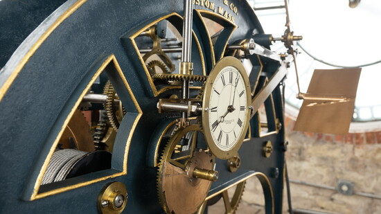 The E. Howard tower clock is a marvel of early 20th-century American engineering. Its distinct horseshoe-shaped cast-iron frame holds two synchronized systems: the timekeeping train and the striking train. On one side, the time mechanism consists of gears, an escapement, and a pendulum, all working in harmony to turn the seven-foot hands on each of the clock tower’s four faces. On the other side, the striking train controls a 40-pound hammer that rings the bronze bell every hour. Though the two systems operate independently, they remain perfectly synchronized through a master gear assembly.