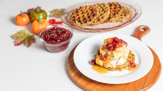 1. Cook the waffles: Heat a waffle iron to medium-high heat. Put ½ cup of the stuffing onto the waffle iron and cook until golden brown, about 3-4 minutes. Repeat with the remaining batter.
