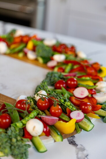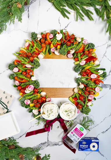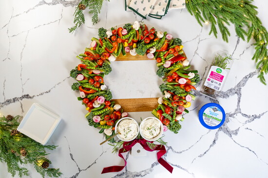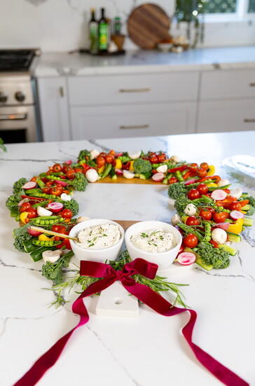 Use seasonal veggies like broccolini, sugar snap peas, radishes, and bell peppers to create a vibrant wreath display, garnished with fresh herbs and paired with a whipped triple-cheese dip. Bonus: The dip can be served warm or cold depending on your vibe.