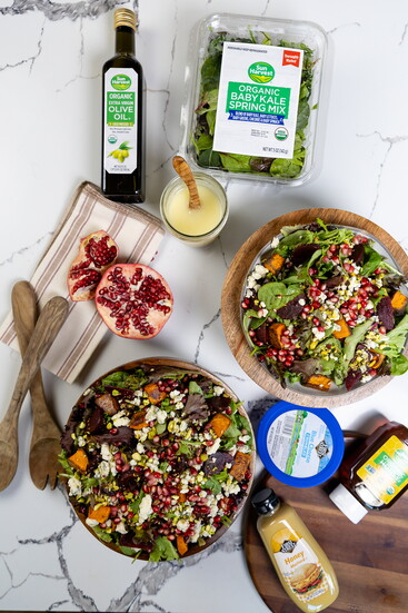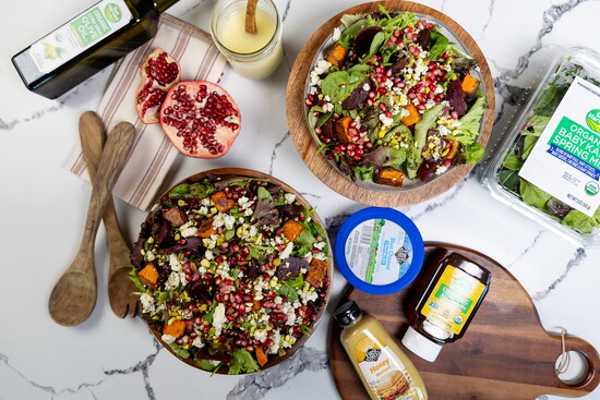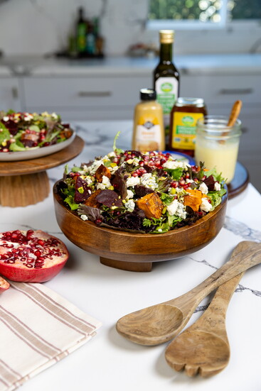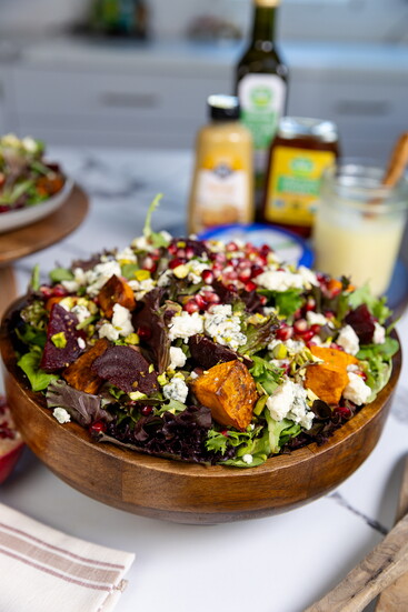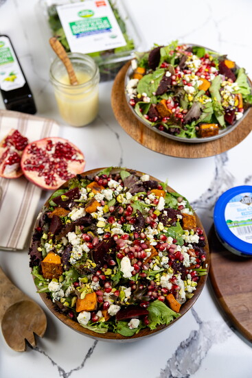 Toss potatoes in EVOO and roast on a baking sheet at 425F for 30 minutes, flipping halfway or until tender and crispy. To assemble salad, add greens into a large bowl. Top with beets, pomegranate aerials, nuts and cheese. Serve dressing on the side.