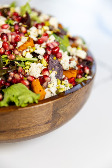 Think jewel tones and winter greens — roasted sweet potatoes, beets, pomegranate seeds, pistachios, and blue cheese over a bed of baby kale. Styled, it’s a show-stopping (and nutrient-packed) centerpiece that doubles as décor.