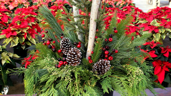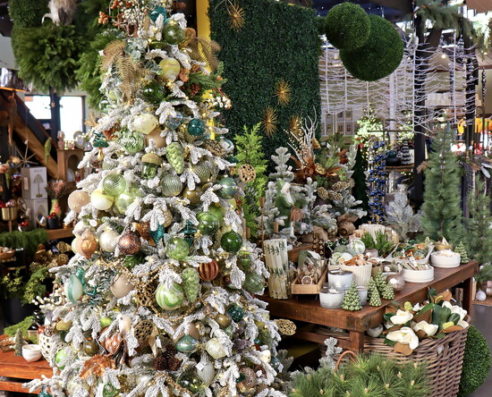 The showrooms are filled with permanent garlands, wreaths, and holiday picks, along with a wide array of ornaments and decorations. But the enchanting Christmas experience doesn't end there. Upon entering the greenhouse, you'll discover benches overflowing with cheerful holiday plants, including poinsettias and holiday cacti, all homegrown by Family Tree Nursery. As you exit the greenhouse, you will find bundles of fresh-cut greens, Christmas trees, and ready-made holiday container combo pots.