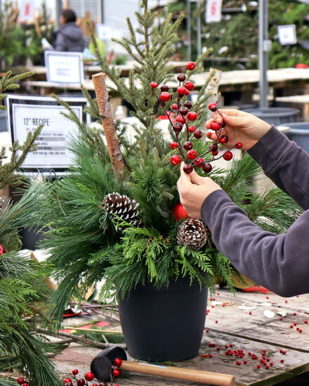 If you're interested in hosting your own workshop or making a container on your own, here is a holiday container recipe with all the necessary items available for purchase at Family Tree Nursery.