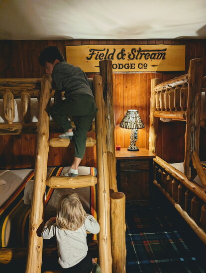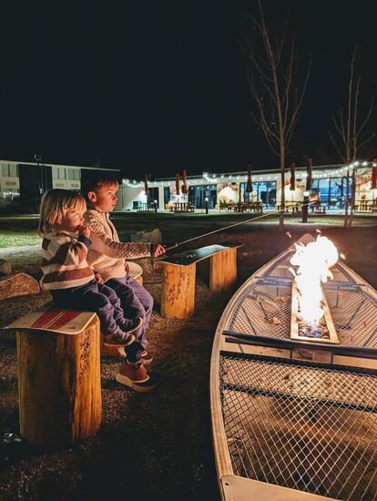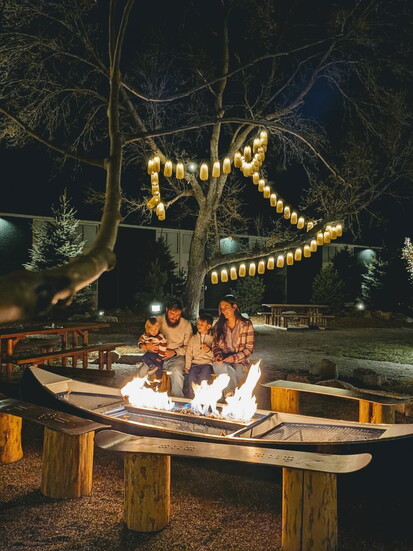 The Honey Hole is right next door and a perfect after-hours pairing to dinner. Lighted games make for a kid-free indulgence and laid back, before-bed entertainment. Other notable amenities include the 1,300-square-foot indoor pool, an outdoor hot tub, and a 29,000 square-foot courtyard, lovingly referred to as The Backyard, where lights are strewn on tree limbs, lanterns illuminate the gravel paths that wind between fire pits made within old canoes—prompting any visitor to pursue adventure, even if imaginary while roasting a marshmallow from repurposed snowboard benches. For a child, the fenced space is a runway for roughhousing and firelight snacking.