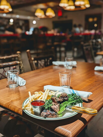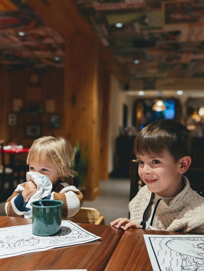 On the main floor near the living room-like lobby, known as The Great Room, is Dry Fly Saloon—the ultimate all-day dining destination where anyone can belly up for a cold beer or a hot meal that feels like home. The bold design of a ceiling collage of magazine covers and the hidden river names found within the overhead table lights are subtle reminders that adventure is just a sleep or recharge away. With ample bar seating, a conversation isn’t hard to find. Meanwhile, my little family scrambles over a word search with a mug of crayons spilling onto the table. A steak with a thick ribbon of chimichurri is served to my husband and a flaky chicken pot pie is nested in a cast iron pan—a delight on a winter day!