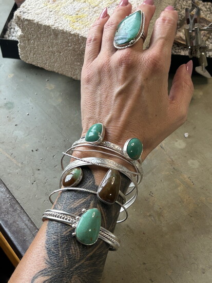 The jewelry itself reflects that layered journey. Described as handcrafted sterling creations, each piece carries a sense of grounding and intention. Sterling silver and turquoise are central materials, chosen as much for emotional resonance as aesthetic appeal.