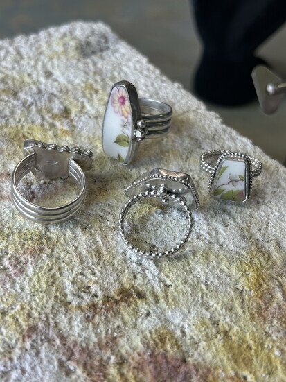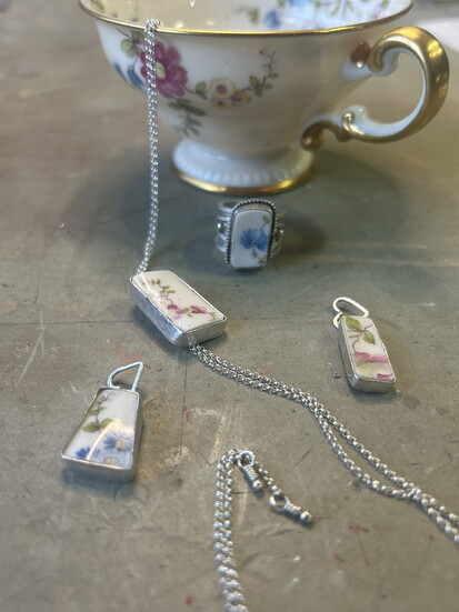 That same reverence carries into some of Mochuelo Designs’ most meaningful offerings. When creating heirloom jewelry from vintage family china, Summerville approaches the process as a quiet ceremony rather than a technical task. She spends time in prayer and meditation, intentionally honoring the family member whose china is being repurposed. Rather than seeing the process as breaking something old, she frames it as continuing its story in a new form, transforming sentimental objects into wearable heirlooms meant to be loved again.