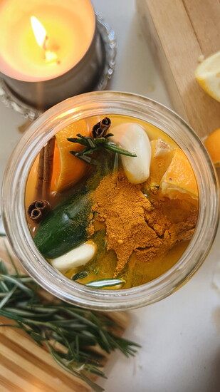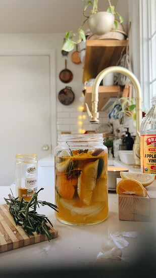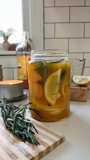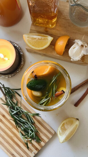 It’s very simple. You cut up an onion, a lemon, an orange, grab a few garlic cloves, some rosemary, cinnamon sticks, some turmeric and ginger root if you have it. Violently squeeze it all in a jar, add the apple cider vinegar and honey, and shake the crud out of it. That’s it.