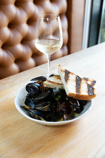 A signature pairing: mussels, scallops, and Argentinian red shrimp tossed with housemade pasta. Jakobi pairs it with Gavi, a small-production Italian white. “It’s off-the-wall and niche, but it’s beautiful. The salinity of the seafood just sings with it.”