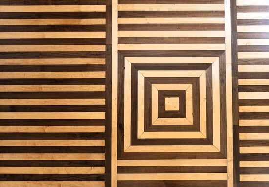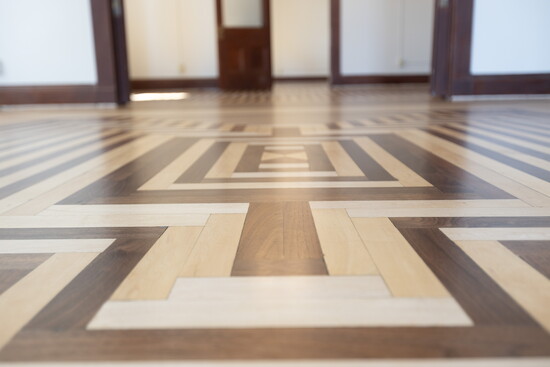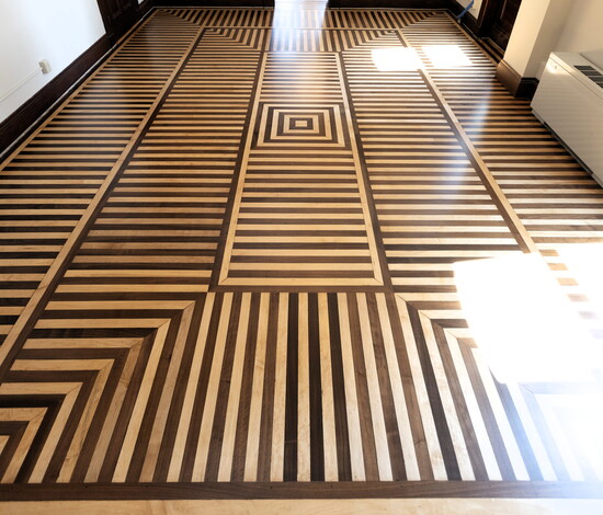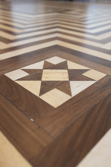 The team quickly realized that traditional sanding methods wouldn’t do. “Preserving the integrity of the original installation was our priority,” said Kevin. “With two different species of wood—dense maple and softer walnut—strategic sanding with precision was essential. The process we chose was slower, and our team worked deliberately to maintain the floor’s flatness and integrity. Our goal was not to sand the floor to complete re-finish perfection, but to install a perfect floor. The goal was to preserve a floor aged with beauty.”