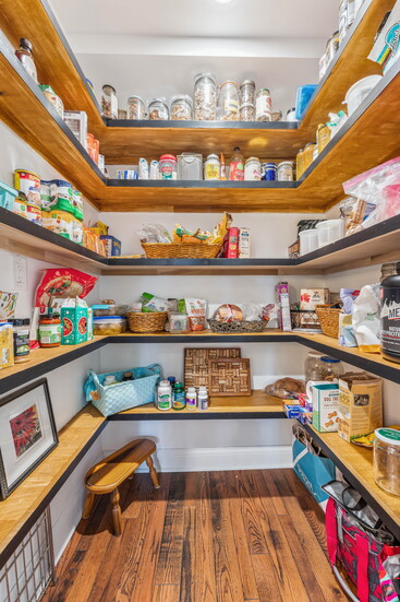 Space was borrowed from an oversized powder room to make it right-sized, allowing the team to carve out a generous walk-in pantry behind it. What had once been wasted square footage now supports everyday living.