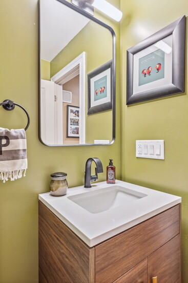 During demolition, original alternating-width hardwood floors were discovered beneath the powder room. Rather than replace everything, the team sourced matching planks and blended old with new—honoring the home’s era while refining its function.