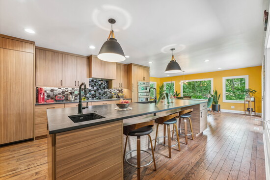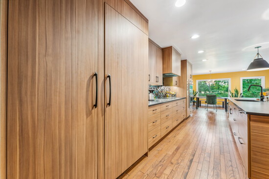 Even the cabinetry grain direction reflects intentionality. Horizontal grain runs along the base cabinets, while tall and upper panels run vertically—originally a response to material constraints, but ultimately a design decision that adds subtle architectural rhythm.