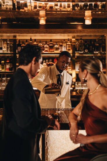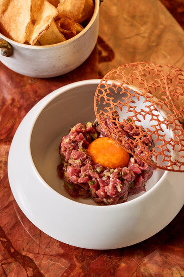 Tucked off the lobby, the restaurant reveals itself in cinematic fashion. Guests enter through a small reception and find themselves in a transformative Old World space where Hollywood Regency style reigns. Designed by British-based Martin Brudnizki Design Studio—known for the recent makeovers of Eden Rock in St. Barths and Annabel’s in London—the room glows with emerald malachite walls, hand-crafted straw marquetry, antique mirrored ceilings and a curated mix of impressive art ranging from historic photography to contemporary works. Velvet banquettes, a smattering or romantic two-top tables and a glowing backlit bar complete the scene, conjuring intimacy with a touch of decadence.