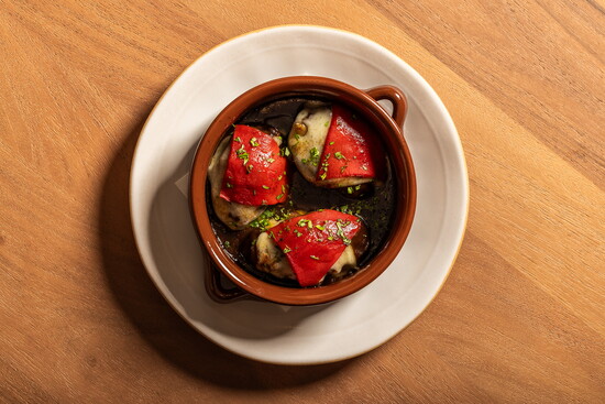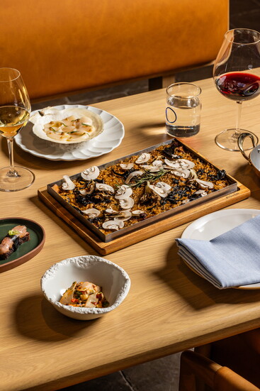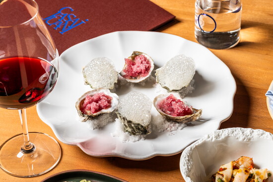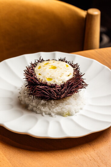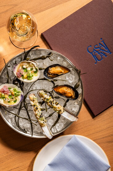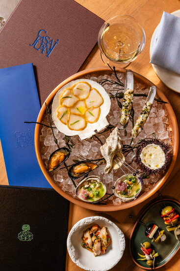 Menus reveal Juanita’s influence, from a simple Spanish omelette with eggs, olive oil, potato and salt flakes, to a mushroom, rice and Périgord truffle dish, to croquetas—small, breaded rolls filled with bechamel sauce and cinco jotas jamón Ibérico, Spain’s most premium free-range ham. This particular pig, Valle Lobo says, is a symbol of Spanish cuisine. The animal grazes on acorns to produce a distinct nutty flavor, and just one leg can be worth up to $1,300. A highlight of Casa Juani’s offering is the marisqueria seafood bar, where chefs prepare raw dishes like razor clams, oysters, mussels with clam ceviche, scallops with onion and tarragon, and a sea urchin custard complemented by ajo blanco and green grapes. Jeun says their many travels to Madrid, where popular markets offer dozens of fresh fish and restaurants showcase seafood in dining rooms, inspired their own display.