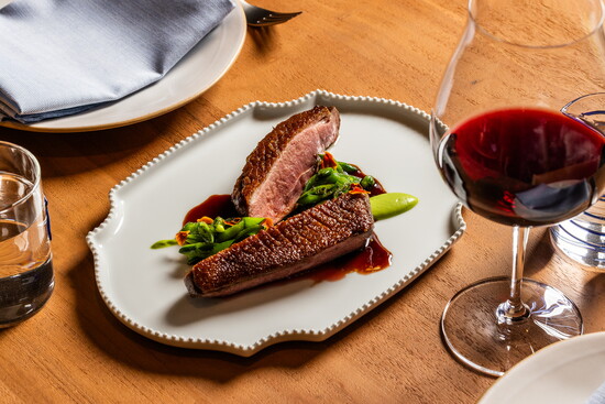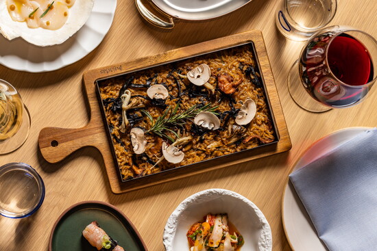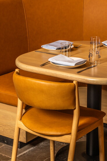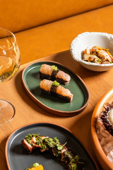 Restaurant interiors lean on a Mediterranean minimalist aesthetic, allowing the food to take center stage. Boulder architecture firm Arch11 infused the space with Iberian design flair—earthy and modern with stone and marble accents. Valle Lobo and Jeun found various plates, bowls, and other ceramics in showrooms across Madrid, Barcelona, and New York. Attention to detail is visible in the plating, where the couple’s culinary creativity shines.