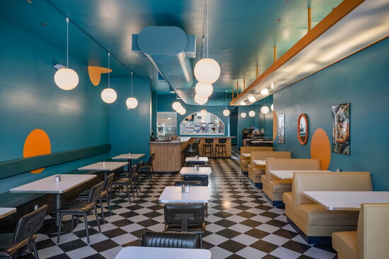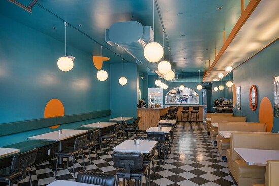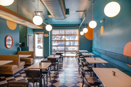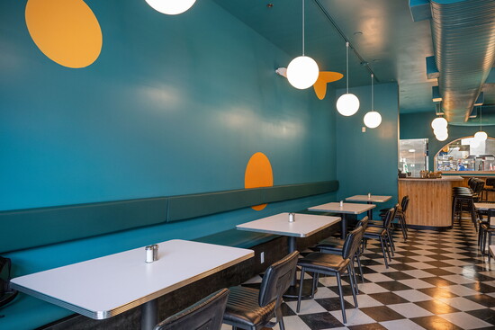 Every aspect of the restaurant was designed with intention. When the team first got the keys, the space was a uninspired rectangle of concrete floors and cinderblock walls. Tanner, who had developed a love for design, took the lead. He introduced rounded arches, globe lights, and a curved bar faced with textured wood. Inspired partly by disco aesthetics, he painted the entire space a bold retro blue, which was a decision he briefly doubted until the flooring and lighting brought the space together. “I almost cried thinking I’d made a mistake,” he shares, “but in the end, it was exactly what the space needed.”