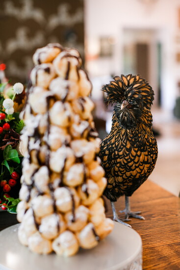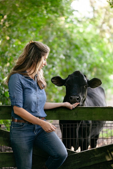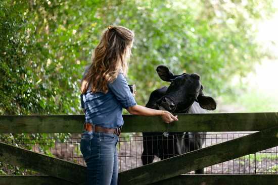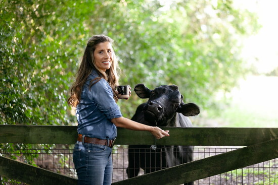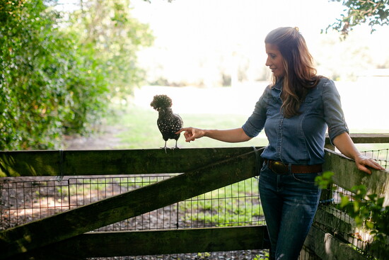 Her picturesque farmhouse embodies that feeling in every sense. Set on a quiet stretch of land where cows graze and chickens wander freely, it’s a home that balances elegance with authenticity. Inside, her kitchen is the heartbeat of it all—a ten-foot wood island trimmed with white marble anchors the space, flanked by white cabinetry with gold hardware. A striking black-and-gold range adds contrast and warmth, while an antiqued mirror above it reflects the window over the sink—a window framing the open pasture beyond.