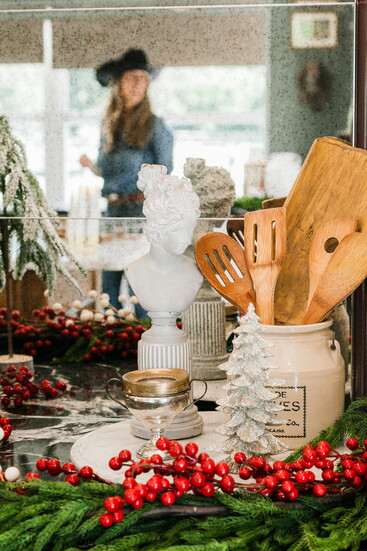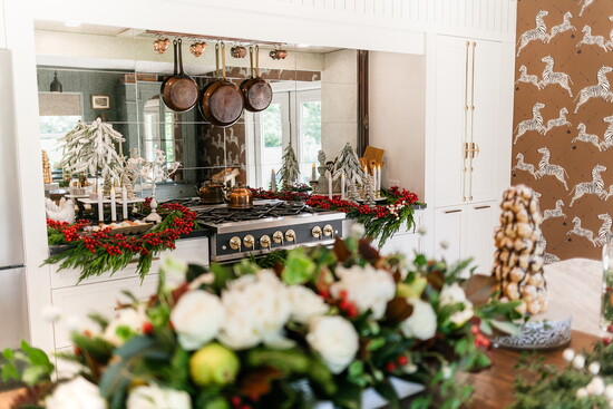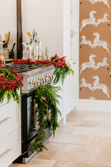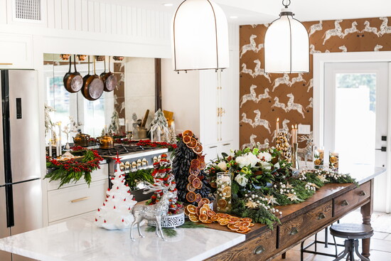 Her design philosophy mirrors that same lived-in warmth. “Kitchens that incorporate furniture pieces are so much more thoughtful and meaningful to me,” she explains. “I love using an antique table as an island or an armoire as a coffee station. I relish those details—the conversation that’s created through history by putting old things with new things.” During the holidays, she leans into that philosophy, decorating with personal pieces that tell her family’s story: antique ornaments from her grandparents, a white ceramic Christmas tree her grandmother made by hand in a pottery class in 1984, and the sleigh bells from her grandfather’s farm that once jingled on his horses.