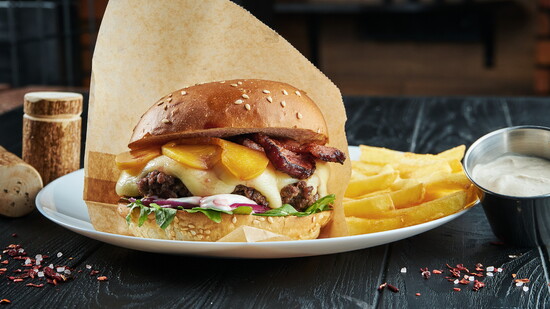 Place burger on toasted Brioche bun, top with peaches,bacon and spinach. Sprinkle with Fennel & Fire Fire Salt to taste.