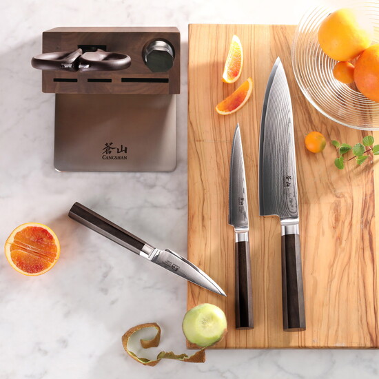 13. Cangshan Maya Six-Piece Knife Block Set: These sleek knives feature razor-sharp blades forged from proprietary X-7 Damascus steel and comfortable, octagonal handles made of African blackwood. | Kiss the Cook, $380