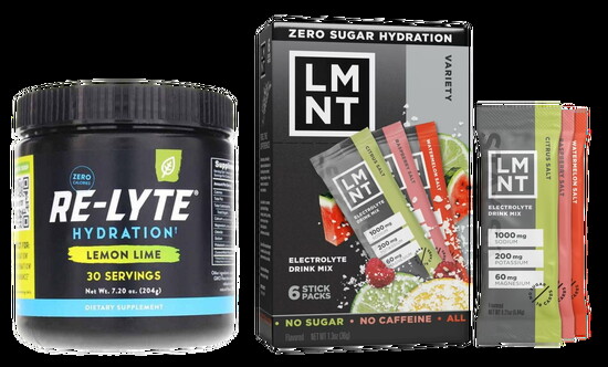 I use and love both sugar-free mixes. Re-Lyte features Redmond Real Salt with more electrolytes, calcium and magnesium, while LMNT has higher sodium (1000mg), no calcium and a simpler citric-acid-flavored formula—both support hydration, energy, focus and muscle recovery.