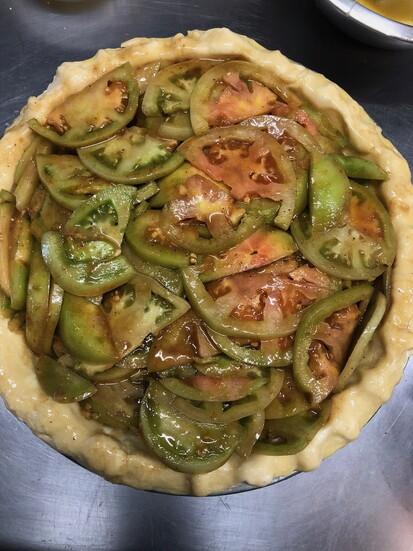 Foreign & Domestic co-owner and Chef Sarah Heard says, “The story is that farmers would have to pick all of their tomatoes, ripe or not, right before the first frost. They would end up with a ton of green tomatoes and had to figure out what to do with them. This recipe is one that I modified from my apple pie recipe. It looks and eats like apple pie with a little extra tartness.”