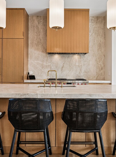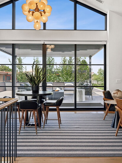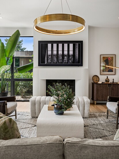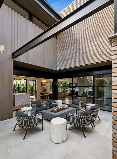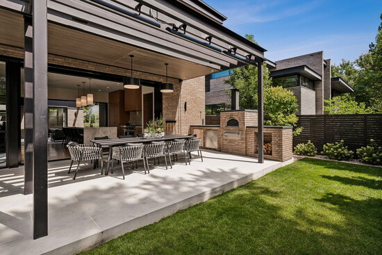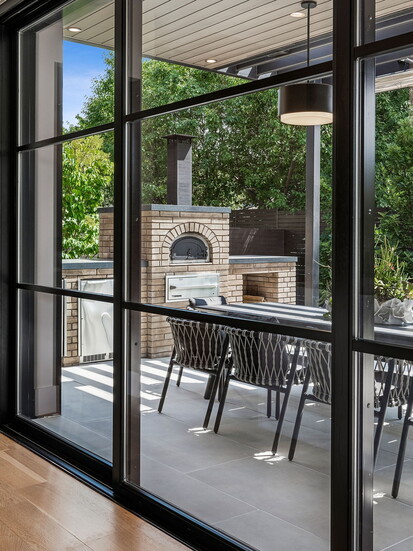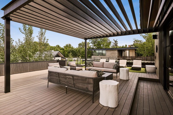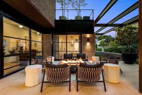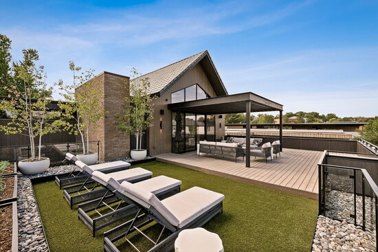 While it’s undeniably in the heart of the city, it’s a true Colorado home with a seamless connection to the outdoors: “There are a multitude of exceptional features,” explains Deviree, “but I most appreciate the outdoor living spaces.” She highlights how the kitchen is wrapped by two outdoor spaces, one with floor-to-ceiling glass sliding doors that disappear to reveal a spacious patio with a pizza oven and a built-in bar and grill. On the other side, additional glass doors lead to a cozy fire pit with outdoor seating that beckons for after-dinner drinks. Upstairs, a sprawling rooftop-style deck is outfitted with lounge chairs and plush seating anchored around a second fire pit, where west-facing mountain views offer an al fresco ambiance like no other.