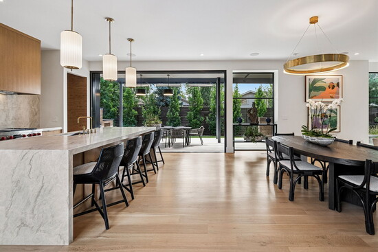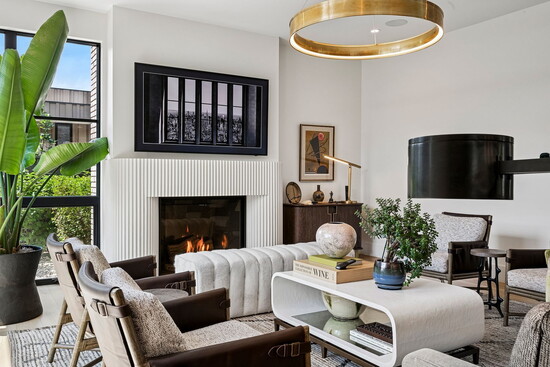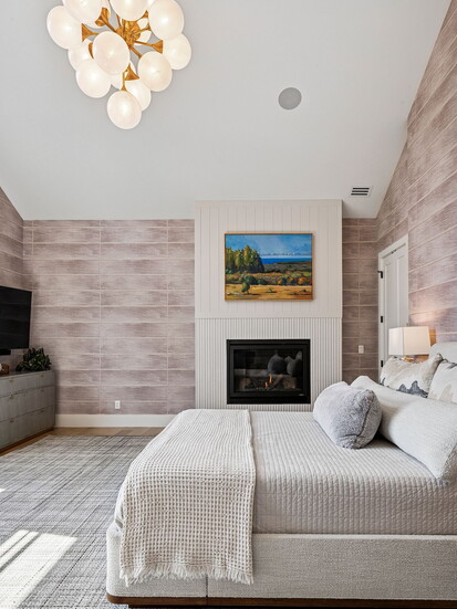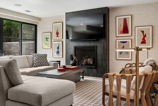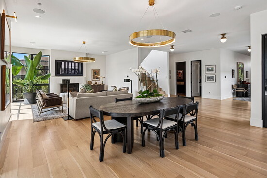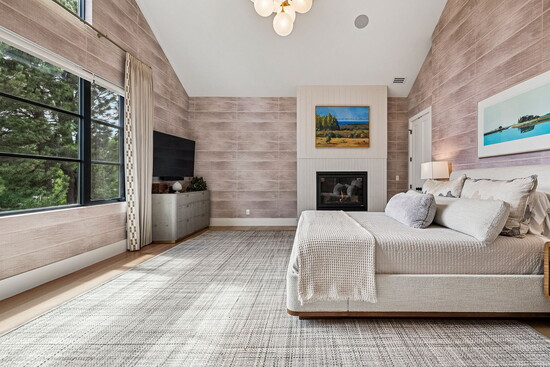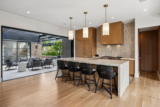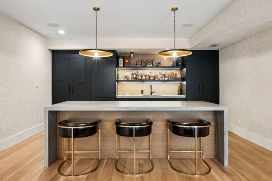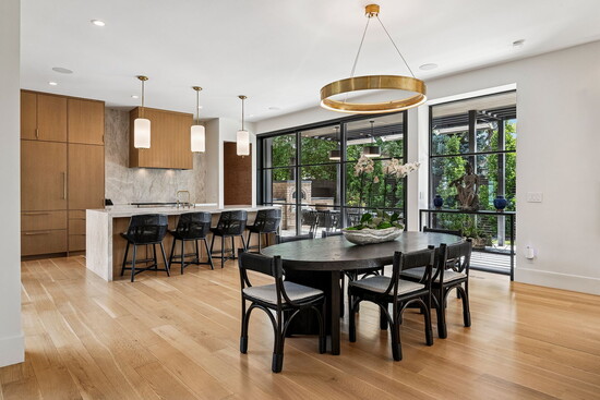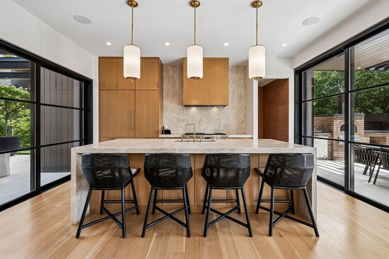 The home’s hospitable mien continues indoors, where three fireplaces across the three stories conjure an atmosphere that’s equally inviting. At 7,000 square feet, the floor plan is designed to easily flex between everyday living and elegant entertaining. From the second guests step through the grand, 12-foot, custom oak pivot door into the entry, an open layout cultivates an intuitive sense of flow. Five bedrooms and seven bathrooms are spread out across the three levels and are accented by amenities like a home gym, an office, and plenty of spaces to entertain, from the 1,500-bottle wine cellar to the full lower-level bar to an upper-level wet bar.