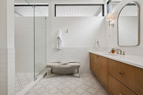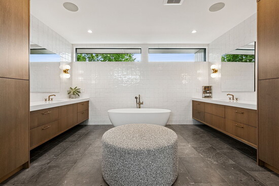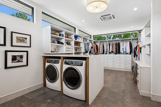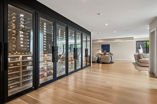 The kitchen, of course, is fashionable and functional, seamlessly connecting to the dining space and living room. But behind the masterpiece of stone and wood is a hard-working prep kitchen, where much of the real action happens. Perfect for stashing countertop appliances and extra dishware, the high-function, high-style space boasts dual dishwashers, wine refrigeration, and copious storage. But for true oenophiles, the wine storage doesn’t end there: out in the heated, three-car garage, you’ll find an additional 250-bottle wine fridge (alongside a convenient dog wash!).