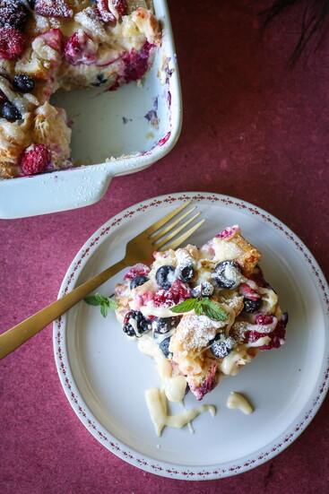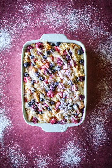 Directions: Preheat the oven to 350 degrees and toast the cubed croissants in a baking dish for 10 minutes. In a mixing bowl, beat cream cheese and sugar until smooth. Add eggs, half and half, lemon juice, vanilla extract and mix until smooth. Place the toasted croissants into a greased 9×13 pan and layer with 1½ cups berries. Pour custard mix on top and then add the remaining berries on top. Cover with foil and refrigerate overnight. Preheat the oven to 350 degrees and bake, covered for 30 minutes. Remove foil and bake for another 15 minutes. Set aside and make glaze by adding all ingredients to a bowl and mixing until smooth. Drizzle over the casserole and sprinkle with powdered sugar if desired.