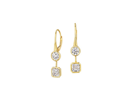 Zadok Collection Earrings These 14K yellow gold earrings are edgy yet classic. They feature a round bezel-set diamond that gracefully suspends a bezel set drop of emerald-cut brilliance. They move beautifully with every turn and offer a modern take that is timeless.