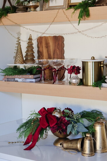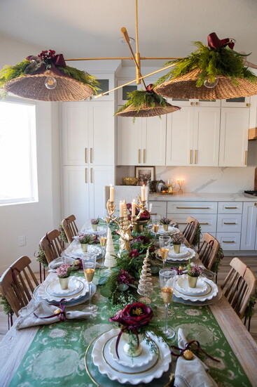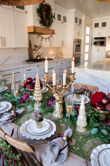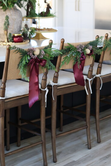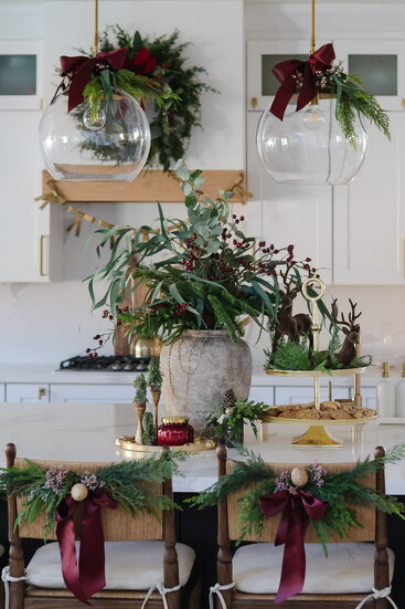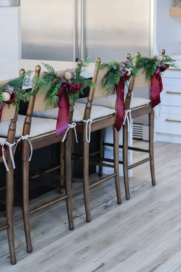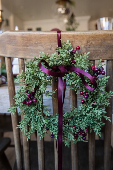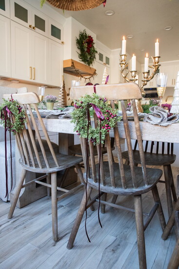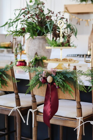 Her rule of thumb: thoughtful details over perfection. “Wrap your napkin with a bow or a small piece of greenery,” she says. “Add a little wreath or swag to the back of each chair. Bells are one of the easiest ways to make everything feel festive.”
