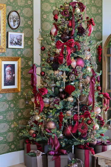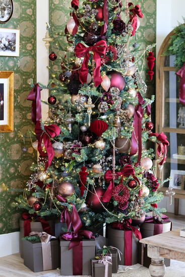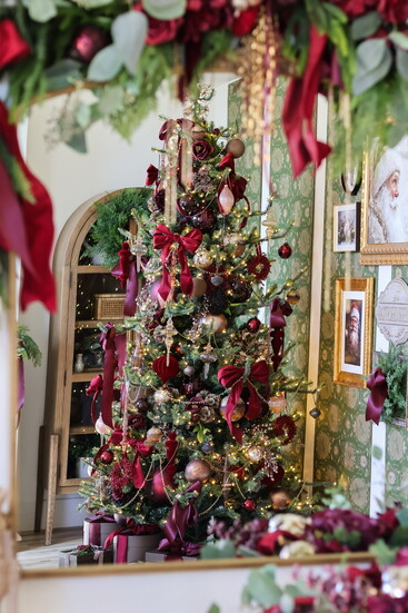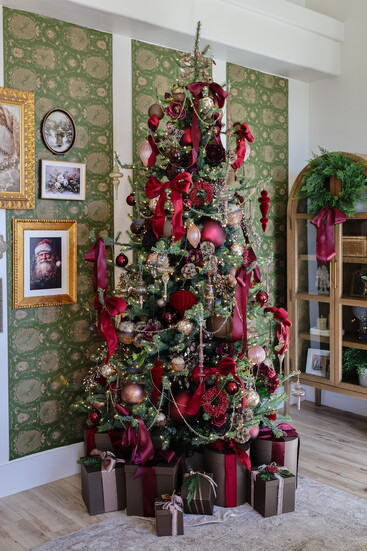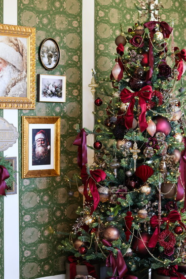 This year’s color trends lean toward richness and comfort. “A classic red and gold tree will forever be timeless,” Hatch says. “But this year, our burgundy tree is the showstopper, elegant, moody, and luxurious. Our sage and brown tree feels warm and natural, and our gingerbread-inspired red, white, and brown design brings nostalgic charm.”