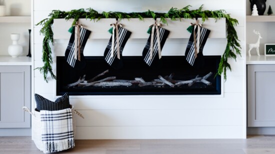 The spacious family room is thoughtfully designed for both relaxation and entertaining. We couldn’t wait to style the client’s new fireplace and custom white oak shelving for the holidays, creating the perfect focal point for festive gatherings. For the fireplace, we opted for a lush faux pine garland that cascades across the mantel, bringing a traditional and natural element to the space. The addition of cozy plaid stockings, accented with taupe velvet ribbon bows, creates a classic yet modern look that adds character and charm.