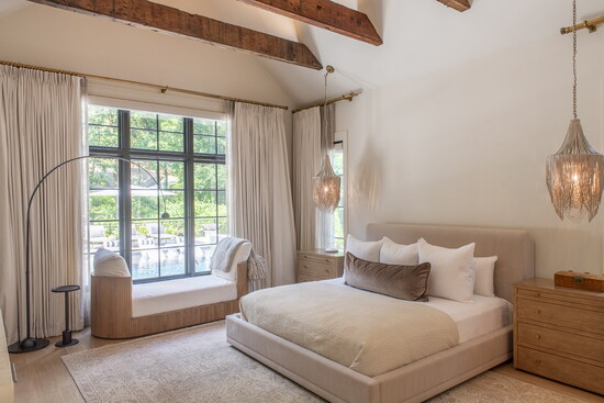 The master bedroom has a soft and peaceful feeling. There is a huge window looking out to the backyard with no other houses in view. "We can push open the window and hear the waterfalls in the pool while laying in bed. I love the vintage beams we ended up putting across the vaulted ceiling, and the leather pendants over the nightstands are so fun."