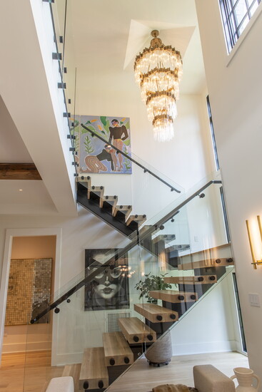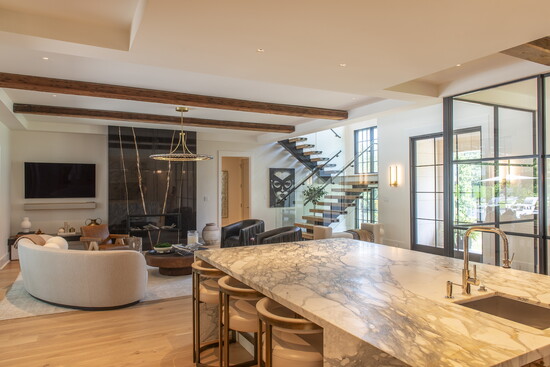 A focus on indoor/outdoor living inspired by the way people live on the west coast, a functionally designed kitchen, a home gym, a floating staircase, and a dedicated dog yard were all must haves in their new home.