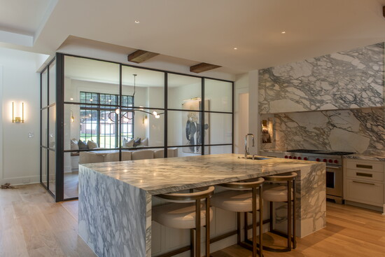 "I knew I wanted statement marble. The beauty of natural stone just can’t be replicated and each piece is one of a kind. Selecting the marble felt like selecting art in a way….I just knew when I saw 'the one'." Ashley made frequent visits to the local stone suppliers for months looking for the perfect pieces. When she saw the slabs the family ended up using on the fireplace, she immediately knew she had to have them. "I began working with Ceramic Harmony on the kitchen fairly early on. They went on a buying trip to Italy and sent pictures of some marble choices they were considering bringing back. I knew I wanted my marble when I saw the picture. The size was also important because I wanted the top of the island to be one solid slab with no seams." Ceramic Harmony was able to line up the veining from sequential slices of marble to create a truly seamless look for the hood, backsplash, waterfall edges, sink wall, etc. "I really wanted the marble to do the talking in the kitchen so I went with a cabinet color that wouldn’t distract, but chose heavy brass hardware from Armac Martin that will patina over time creating a lived-in feel."