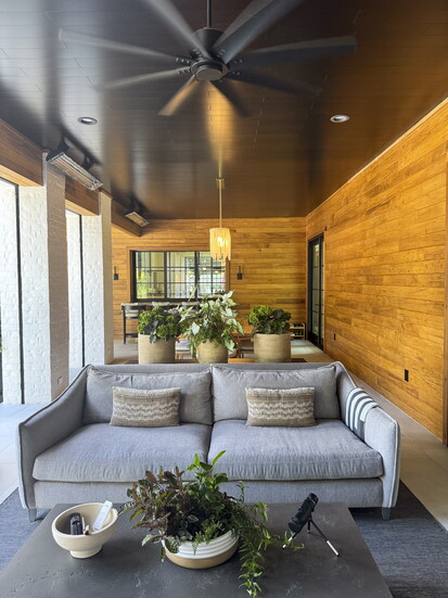 "Indoor/outdoor living really became the focus early on. My husband works a lot of long stretches and is on-call quite often. We wanted to build a home that felt like an escape while still being in close proximity to the hospital," states Ashley. The kitchen has an 8 foot wide sliding window that pockets into the wall, and on that same wall in the living room is a 16 foot sliding door that also opens completely and pockets into the wall, essentially opening that entire wall of the house to the covered outdoor space. The covered outdoor space is set up with ceiling heaters as well as built in retractable screens to enclose the space and keep the bugs out. With the screens down and doors open, the outdoor living areas become a true extension of the indoors. The Tomaltys cook and eat at home almost every night and the island is the heart of their home. Ashley designed the kitchen around the way they live. The island is large, but has seating on both sides so it functions more like a table. "A lot of people tried to talk me out of an island that size, but I’m so glad I went for it. Essentially, when I’m cooking, I am at the head of the table. My son and his friends can gather and we always have room for everyone." She continues, "I have my own dedicated sink and dishwasher at the head of the island so I can easily clean as I cook and there’s no need for anyone else to come into that space while I’m working."