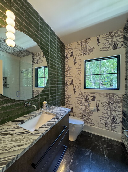 Lighting selection was really important to Ashley. "It’s something I feel makes this home really unique in both the lighting selections and the lighting placement. I put fixtures in reading nooks as well as in niches in the kitchen, and hung pendants over where the side tables would eventually go. I feel those well planned touches make a big difference." Brad Lapidus at Richards lighting had several selection meetings, dealt with many changes, and made multiple sight visits to ensure the family was happy with the final result. We did under cabinet lights under all the floating vanities in the bathrooms and used very minimalistic recessed lighting to distract the eye as little as possible. "The majority of the lighting came from Visual Comfort, with a few selections from Arteriors and Hubbardton Forge." She continues, "I certainly tried to have some fun in certain areas as well, especially in the bonus areas, using green lava tile, with wild textured marble and fun wallpaper with monkeys drinking martinis."