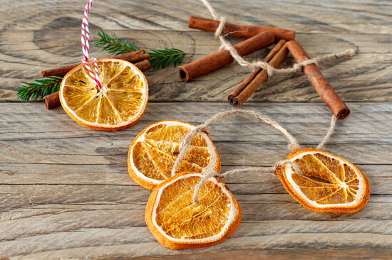 After baking the orange slices for 4 hours, flipping them halfway through. Before handling the oranges allow slices to cool. Use a toothpick or skewer to poke 2 holes on each side of each orange slice. Then use piece of string or twine to string up the orange slices in a line.