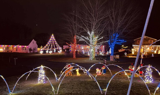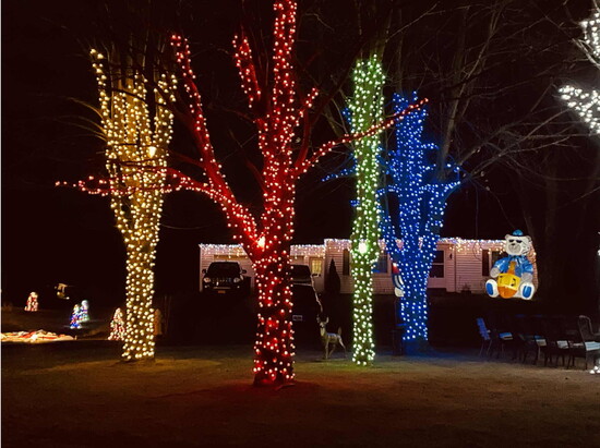 Planning is all year round, Flynn explains. Every year they add something different, with this year’s newest addition being a matrix screen that will go up on the house. Now that technology has advanced and Flynn’s setup is computerized, they don’t need to worry about fuses blowing anymore. Starting on Thanksgiving night, they run the light show through the first or second week in January from 5–10 p.m. every night. On Christmas Eve, they put out close to 200 luminaries around the circle for a special holiday light show.