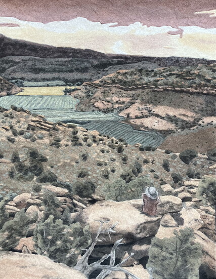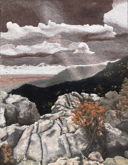 Whenever Gray travels, she always packs a small trowel and a few bags, pulling over along road cuts and hillsides across her path to gather dirt, sand and even coal. These raw materials later become her inspiration and her paint—the reds, pinks, earth tones, greens, and deep blacks—used to create textured landscapes inspired by the places she’s explored. Her work is quite literally made from the land it represents.