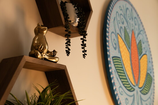 Hung above the door is a simple black sign with a bright lotus flower, inviting you to ‘Be Well.’